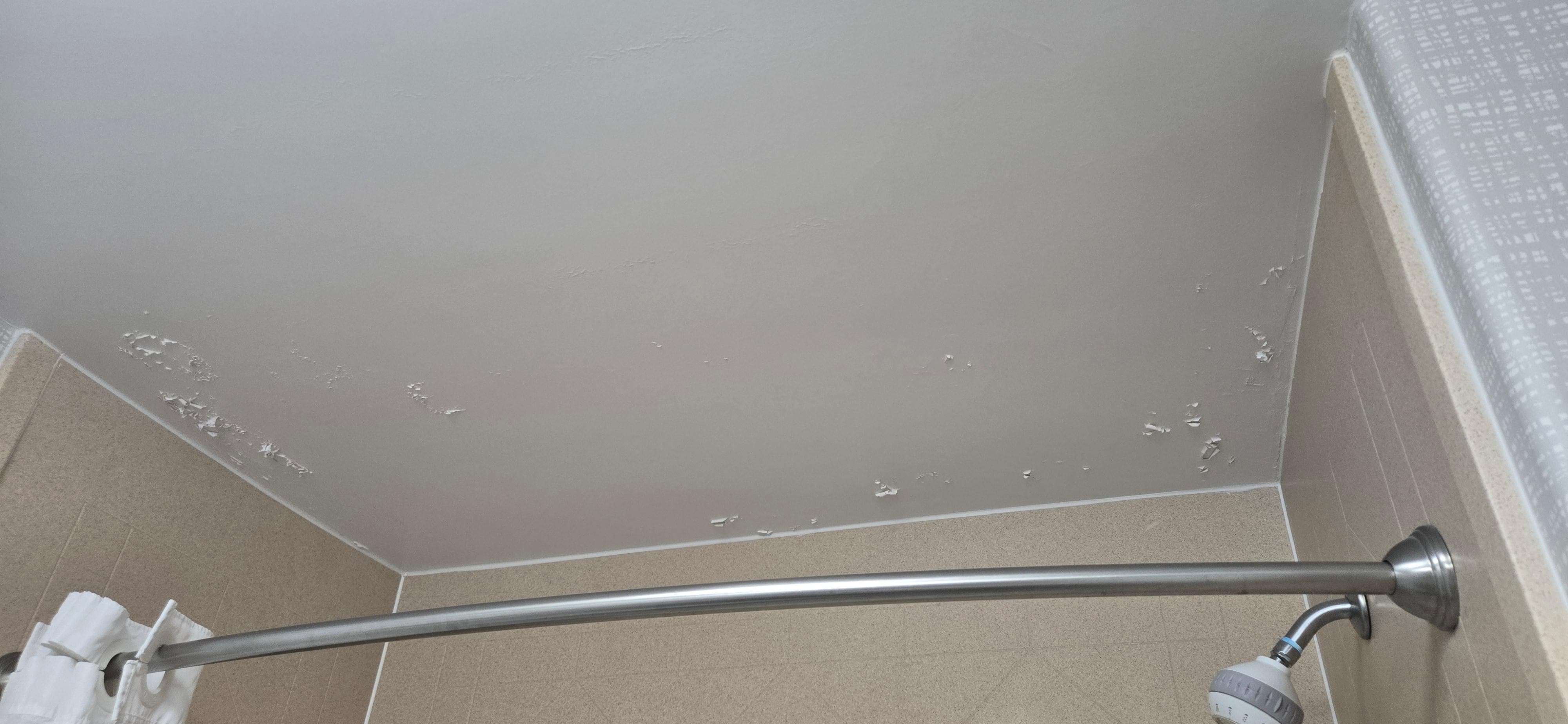 Paint was bubbling all over the ceiling in bathroom. Floor tiles were cracked and moved.