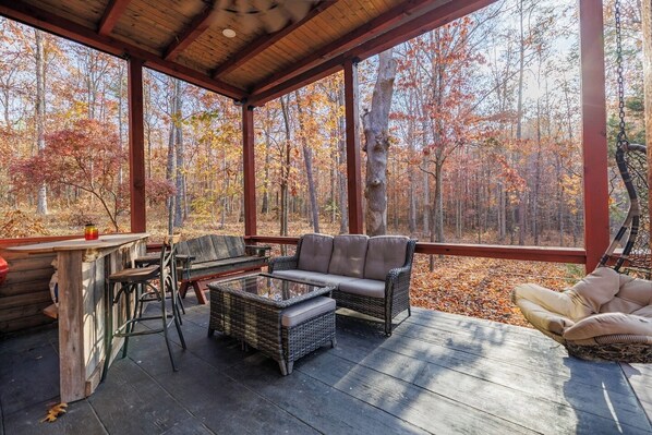 Wrap-around porch and covered side porch with swing. Outdoor bar top, charcoal grill, and fire pit area (wood not provided) offer plenty of space to enjoy the mountain air.