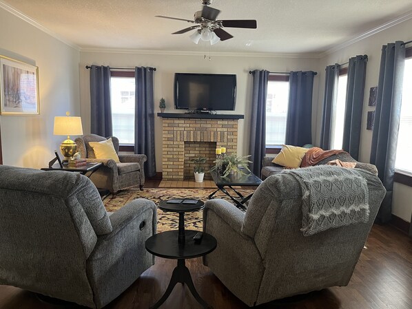 miles from Baptist Hospital, this stylish home offers a serene retreat with 2 living spaces, a multifunction laundry room, and high-speed internet. Unwind on the screened-in front porch or back patio with grill and table.