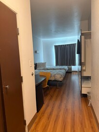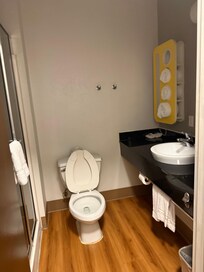 I was definitely surprised at how clean this hotel was. Usually when you think of motel six you think of the 70s and 80s old carpeting rundown. This is 100% just the opposite. It was very neat very clean. It had like fake hardwood floors. So it’s a lot nicer than carpeting. It even had a glass door shower. I was very impressed and I would definitely stay there again.