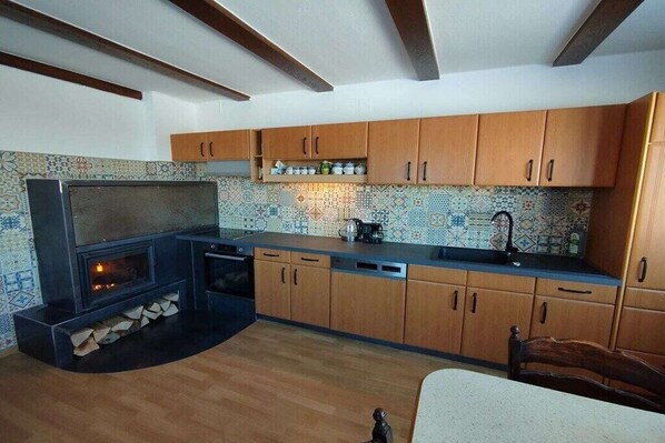 Layout: Ground floor: (Living room(seating area), Kitchen(dining table, stove, hob, electric kettle, cooker, coffee machine, oven, dishwasher, fridge, dishes and cutlery), guest toilet(Mirror, toilet, washbasin), storage(Vacuum Cleaner, tumble dryer, washing machine, drying cabinet)) On the 1st floor: (bedroom(Bed Linen, Wardrobe, double bed), bedroom(Bed Linen, Wardrobe, double bed), bedroom(Bed Linen, Wardrobe, single bed, single bed), bathroom(Mirror, toilet, bath tub, shower, washbasin, heating)) Fire Alarm, Hot Water, Vacuum Cleaner, garage, Internet access, Internet access, First Aid, tumble dryer, washing machine, heating, garden(Barbecue center, Lawn, garden furniture, sun loungers), parking, drying cabinet