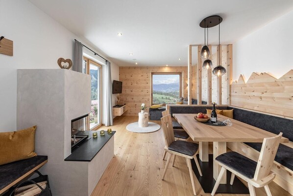 At Apartment Mittermanting in Villnoss, you enjoy a cozy sofa with panoramic window, fragrant pine wood, fireplace, terrace, sunbathing lawn, playground, toys and books for children, table tennis, and a ski and bike storage room. The property offers its own herbs, vegetables, and jam.