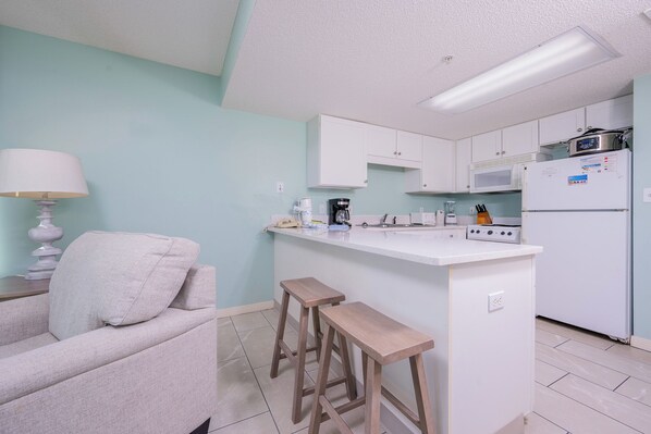 · White cabinets and breakfast bar seating for two in fully equipped kitchen