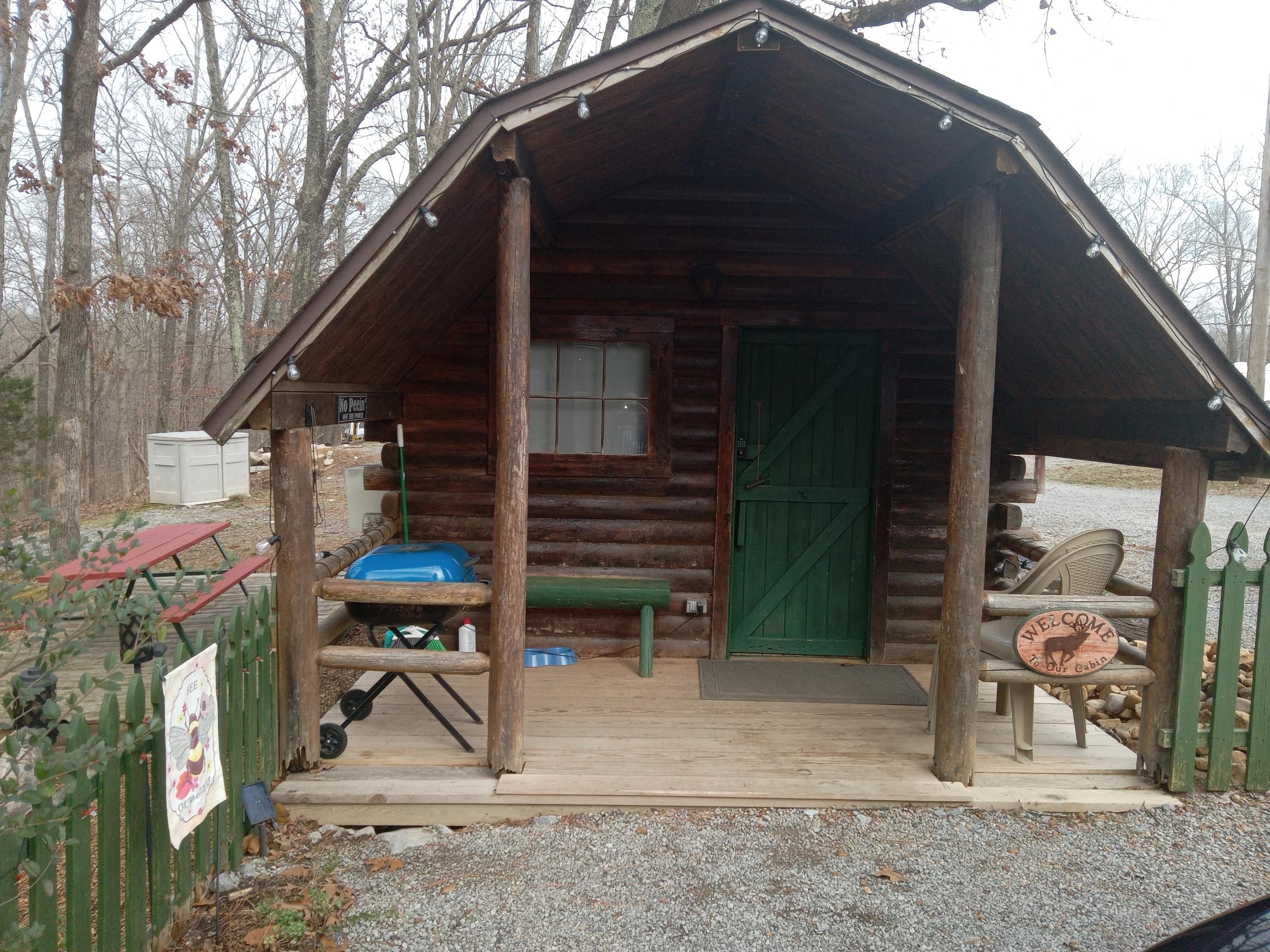 Cabin is open all year round with heating and air conditioning unit. Away from noisy roads, surrounded by oak and pine forests and is part of beautiful, small private campground. It is one simple room made out of logwood which includes two twins and one queen beds, a fridge, small coffee maker, microwave and a ceiling fan.