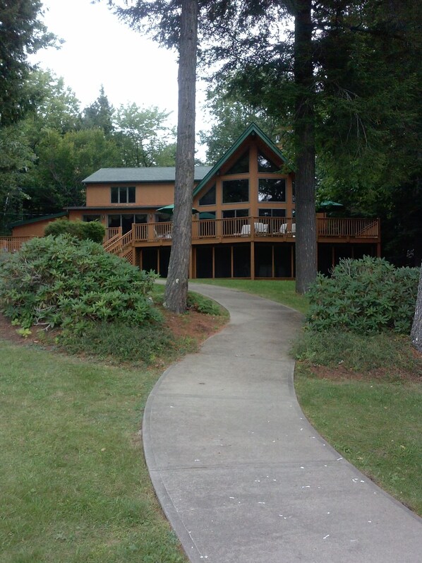 Spacious living room is accented by three stories of glass windows that look out to Long Lake and Mt. Washington.