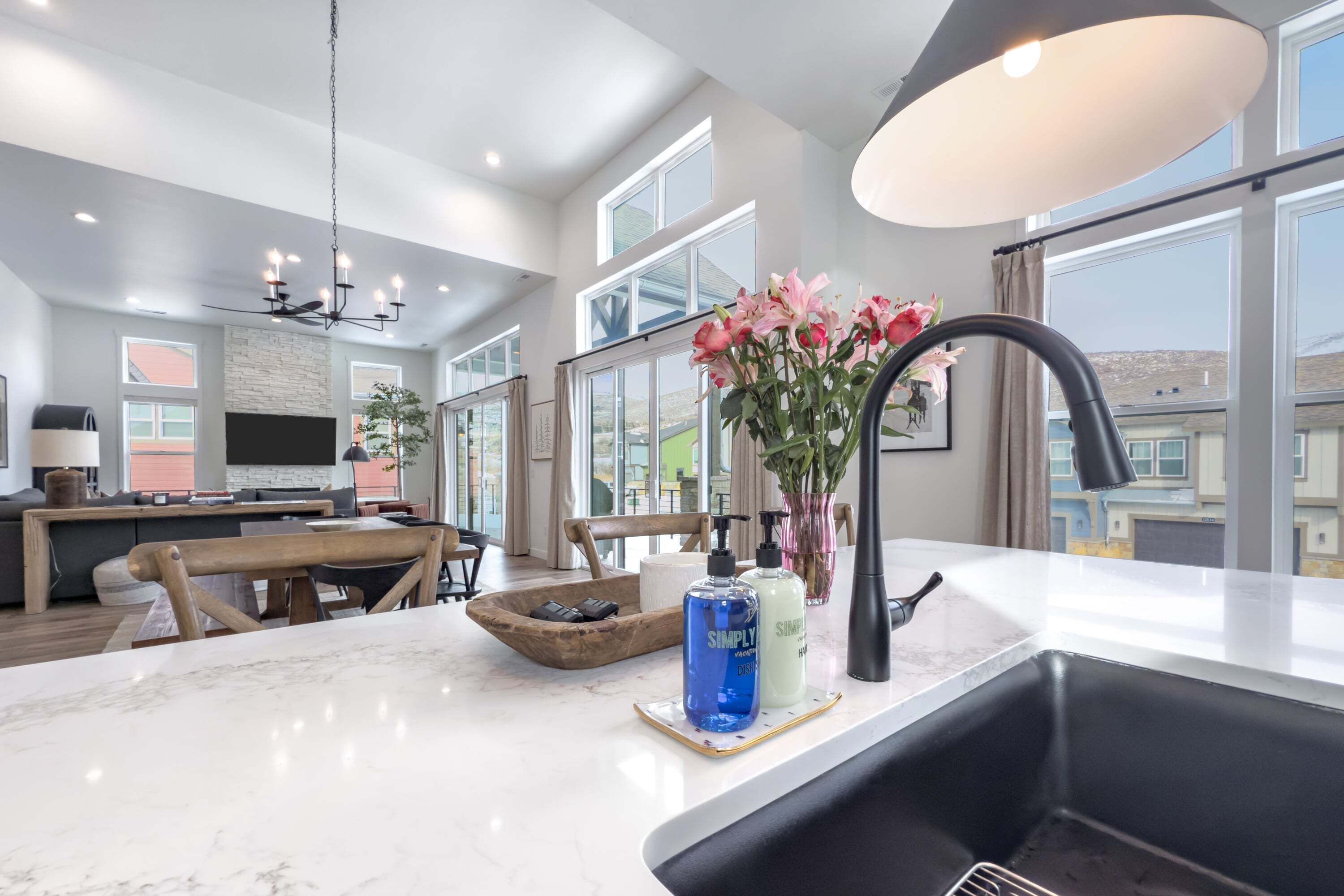 Experience comfort and relaxation in this beautifully designed townhome, thoughtfully crafted to enhance your stay. The main level features an open floor plan that seamlessly blends a spacious kitchen with an island, a dining area, and a welcoming great room equipped with a large-screen TV, a Marshall Bluetooth speaker, and access to a generous deck offering stunning views of Jordanelle Reservoir with a Traeger Grill!!