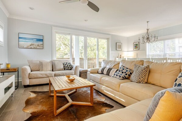 The great room includes a large spacious kitchen with expansive island with 4 bar stools. The kitchen is fully stocked and includes dishes, utensil`s, pots, pans, blender, crock pot, waffle grill and a variety of cooking spices. A large dining room table with seating for 10. The living room area has a large couch, loveseat and a queen sofa bed. around the TV.