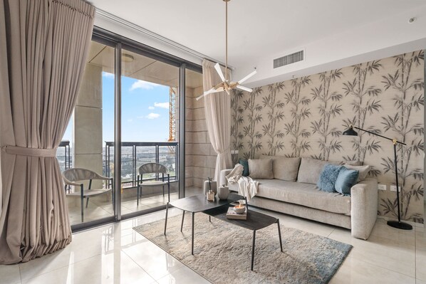 Central two bedroom apartment located in a brand new luxurious building. The rooms are full of light opening on the city center, famous HadavidKa place.