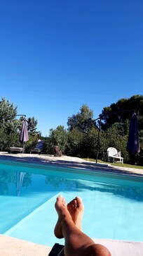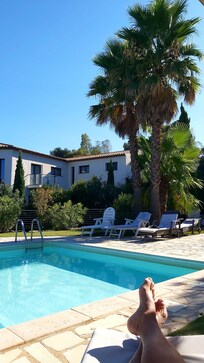 Die Anlage, außen wie innen ist sehr weitläufig und geräumig. Die Wohnräume sind gut geschnitten die 3 Terrassen sind groß, der Pool ist groß. Es gibt 3-4 Stellplätze für Pkw, der Garten hat 2 große Palmen die Schatten spenden. Der Kunstrasen ist von guter Qualität. Der Fußweg zum.Strand, Bus und Supermarkt ist veekehrsarm, zu Fuß ca. 10-15min. Die Lage ist absolut ruhig man hört keinen Verkehr. Der Intermarché hat eine gute Auswahl und immer eine warme Theke. Man käme den Urlaub ohne Auto aus da Busse überall hinfahren (St.Trop, Toulon, LCV)