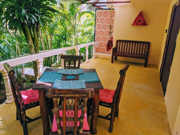 A clean private cabin, to rent, set amongst the abundance of natural beauty of Jurassic Park. The bungalow comes with a fully equipped small kitchen, a queen bed, a bunk bed, a bathroom with shower, and a terrace with view of immediate garden.