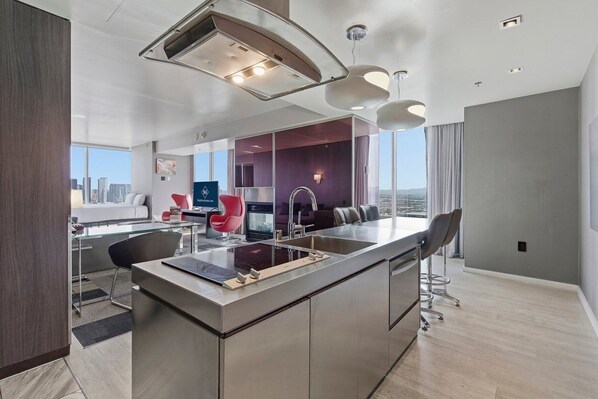 The living room has an ultra-modern sleeper sofa, wood-paneled walls, contemporary light fixtures, as well as stunning floor-to-ceiling windows that look out over the Strip. Kick back on the plush furniture in front of the 42” TV and relax.