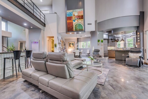 Great Room faces due north, over looks the pool and offers the comfort of a Zero G Recliner, Large L shaped sofa, Breakthrough Medical Massage Chair, Custom Bar with 4 modern leather stools, glass cabinet stocked with bar glasses and glass bar shelving to store your favorite libations.