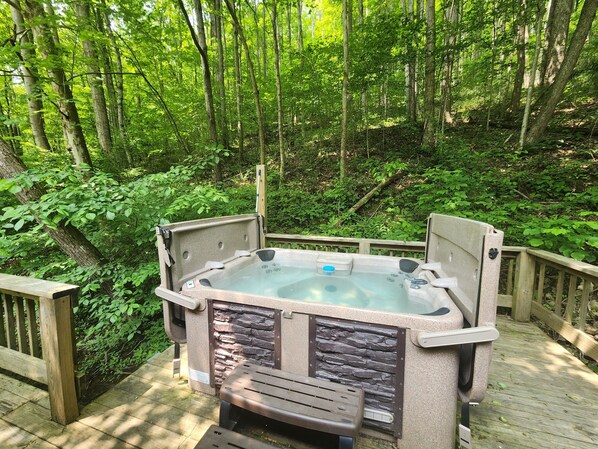 Ultimate in privacy for the perfect woodland retreat. Wifi streaming TV, hot tub, 3 bedrooms and laundry. Pool table, game room, bar. New construction covered balcony. All on 27 wooded acres! Your family vacation destination! 2-night min.