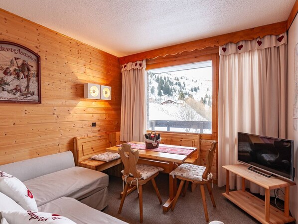 Divisible studio with two convertible sofas and a double bed (140x190). Kitchen equipped with induction hob, dishwasher, microwave, kettle, coffee maker and fridge. Bathroom, separate WC. Balcony. Ski locker in the residence. Elevator. Non-smoking apartment.