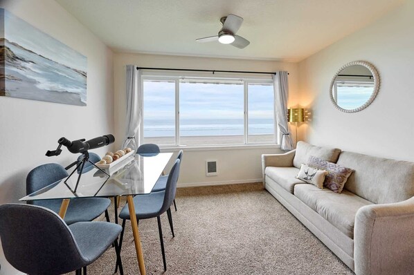 This cozy condo is located on the second floor, can sleep six people. It features two queen beds—one in the private master suite and one in the living room as well as a pull out couch in the living room, ensuring everyone has a spot for a good night’s rest, and has two full bathrooms a full kitchen with cookware. Enjoy our incredible views and sit in the window to watch the waves & whales!