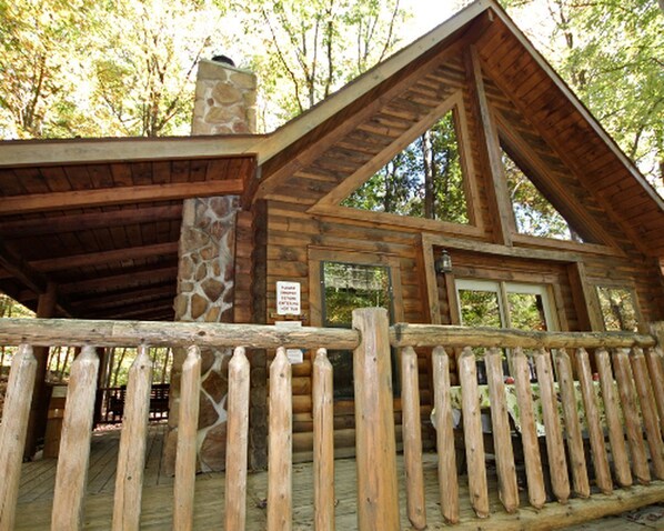 This cabin for rent in the beautiful Hocking Hills region of Ohio has enough room to comfortably accommodate up to four guests. There is one queen-size bed in the main level bedroom and another queen-size bed in the loft. This cabin also has a living room equipped with a couch, a wood-burning fireplace, a rocking chair, a coffee table, and a satellite TV. This cabin also has air conditioning. The kitchen is equipped with a microwave, a stove, an oven, a refrigerator, a toaster, a coffeemaker, and a dining table for four.