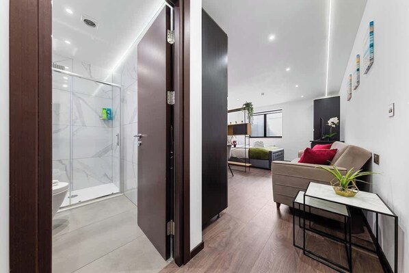 Our studio flat is a brand new and cozy living space that provides guests with a peaceful and comfortable environment to relax and unwind. The studio has a spacious living area with plenty of natural light that floods the room, creating a bright and inviting atmosphere. The flat includes a fully-equipped kitchen where guests can prepare and cook their favorite meals, along with a king-sized bed that ensures a good night's sleep. A convenient ensuite toilet is also included for added privacy and comfort. The studio is perfect for both leisure and business travelers, and we have included essential amenities to make sure guests have a comfortable and convenient stay.