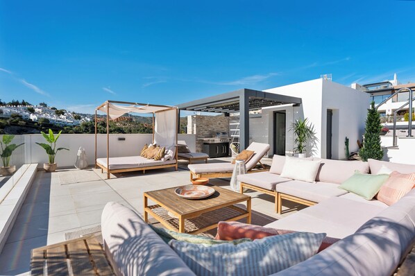 Our modern duplex apartment has a practical and bright layout, with large solarium terraces that offer impressive views of the golf course and the sea. Enjoy moments of relaxation and entertainment on our terraces, where you will find comfortable sofas, outdoor dining tables, and sun loungers. Additionally, our upstairs sun terrace features a beautiful small elevated private pool, perfect for cooling off and enjoying the Mediterranean climate.