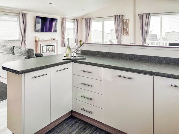 Shower Room: Cubicle Shower, Heated Towel Rail, Toilet. Gas central heating, electricity, bed linen, towels and Wi-Fi included. Terrace with garden furniture. Grounds (shared with other properties on-site). Sauna (shared with other properties on-site, open February-November). Indoor heated swimming pool (shared with other properties on-site, open February-November) with shower and changing facilities. Private parking for 2 cars. No smoking. Please note: There is a step in the grounds.. This immaculate and spacious holiday lodge, located on a sought-after park near the sea, offers the perfect escape for families or groups looking to relax in style. The lodge boasts a large open-plan lounge, kitchen, and dining area, with French doors opening onto a generous west-facing deck, perfect for soaking up the afternoon sun and experiencing the breathtaking Morecambe Bay sunsets. Enjoy ultimate comfort in the lounge with two plush sofas and TV, while the dining area comfortably seats six. The modern, fully equipped kitchen makes dining a breeze. The lodge offers three bedrooms, a master suite with walk-in wardrobe, En-suite shower room, and TV, plus two twin rooms with full-size single beds. A stylish family bathroom with a corner shower completes the picture.