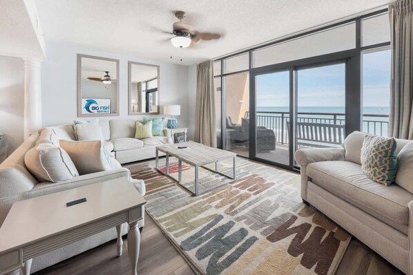 We thoroughly enjoyed our stay at this spacious condo! It comfortably accommodated our group with three bedrooms, three full bathrooms, and two additional pull-out couches in the generous living area, easily sleeping up to 9 guests. The highlight was definitely the large, oceanfront balcony – perfect for relaxing with family. One small note for future guests: as a privately owned unit within the resort, beach towels are not provided and are only available to hotel guests through a vending machine. We highly recommend packing your own. Also pack paper towels and laundry detergent. The condo's location is superb, with easy access to grocery stores and fast-food options. A perfect family getaway!