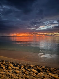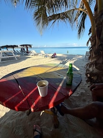 The beach area was perfect with lounge chairs, and you can easily walk along Seven Mile Beach. At night, there are nearby spots with live music and bonfires just a short walk away.