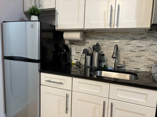 The fully equipped kitchen includes a stove, microwave, refrigerator, coffee maker, cookware, and essential utensils—perfect for preparing meals, enjoying breakfast before heading out, or winding down with dinner at home.
