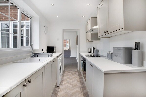 The kitchen is equipped with all the essentials needed to cook an array of meals whilst away in Houghton. There is an electric hob, oven, fridge/freezer, microwave, & washer.