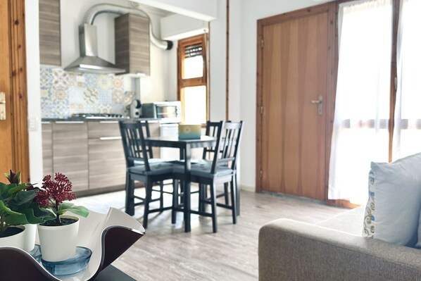 Description: ground floor accessible by stairs. Living room with double sofa bed, dining table and kitchenette – bedroom with double bed, air conditioning and access to the garden – bathroom with shower cubicle – large garden with outdoor table and chairs.