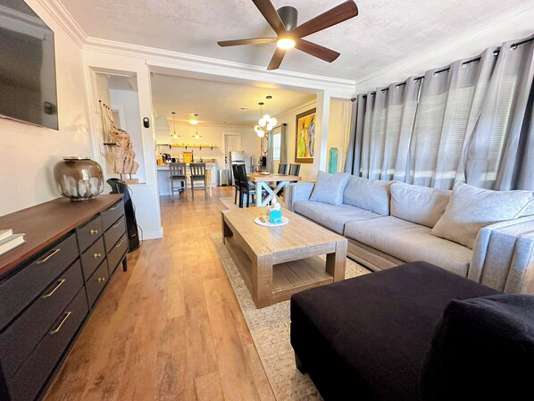 - Living room with plush sofa & Smart TV.