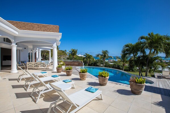 The french word "Beauvoir" means "Beautiful View" and Villa Beauvoir more than lives up to its name. With its location in the hills of Parc de la Baie Orientale, the views, not only, sweepover Bai Orientale and waters of the Atlantic Ocean, they also include wonderful views of Tintamarre and Pinel. A four-bedroom gem of island design and décor Villa Beauvoir is a destination all on its own. Situated in a gated community, the house follows the curve of the landscape surrounded by tropical vegetation. The structure is a unique blend of tropical architecture, modern design and classical style. Situated on a small hillock, the large plot provides lots of private outdoor spaces. Savor the views from the shade of the covered pool terrace that sits at the front of the structure and provides space for multiple outdoor lounging spaces. There is the elegantly shaped pool framed by the immense wooden deck. Also enjoy the small deck furnished for sunbathing and another designed specifically for al fresco dining. Multiple lounge areas are tucked beneath the verandah. The grill and barbecue area, and a gazebo round out the outdoor spaces.