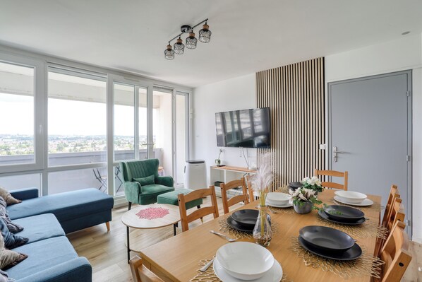 - A spacious living room with a dining table and a television and WIFI access, a breathtaking view of the north of Paris.
