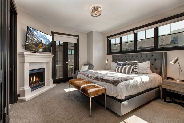 Master bedroom— King size bed, Smart TV with Xfinity cable, cozy gas fireplace, and a private balcony where you can enjoy the views. The private bathroom has separate vanities, a soaking tub and a lovely tile and glass shower.