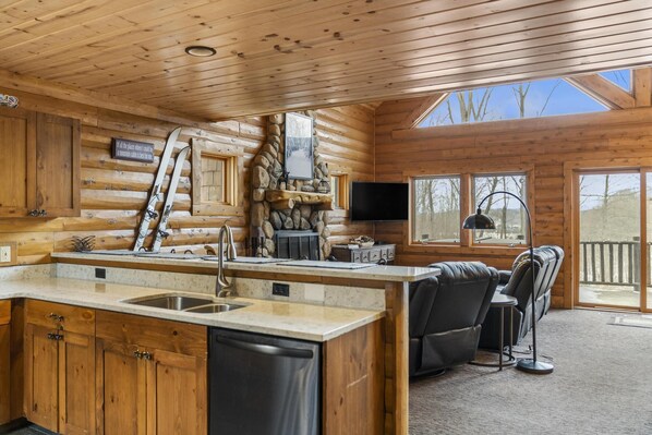 Cozy Great Room with fireplace, fully equipped Kitchen, Full Bath, Bedroom One/Queen