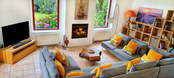 With a capacity of 12 people, our residence offers a very large living room, opening on the sea view and the garden, which integrates the dining room and the large sofa in front of the fireplace - the whole invites to cocooning!
