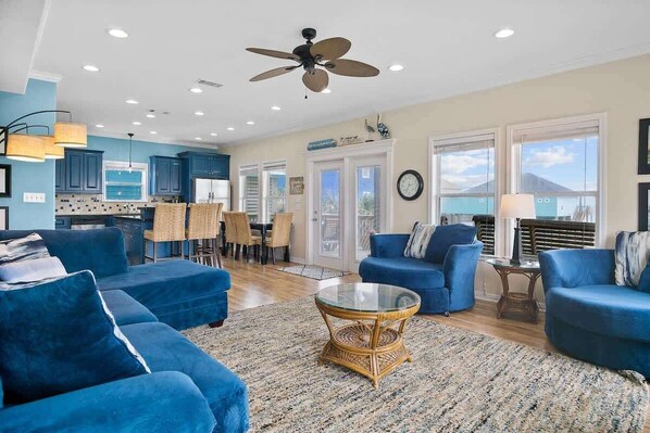 With nearly 2100 square feet, Pelican Crossing has room to accommodate 14. There are two bedrooms located on the main floor and 2 bedrooms located on the 2nd floor. All the bedrooms have their own televisions, and there is high speed internet for your convenience. On the main floor, the primary suite has a king bed and an ensuite bathroom with a large walk-in shower. The second bedroom has a king bed, while the third has two queen beds, and the fourth has one queen bed. For additional sleeping the 2 blue chairs upstairs become full-sized hideaway beds.