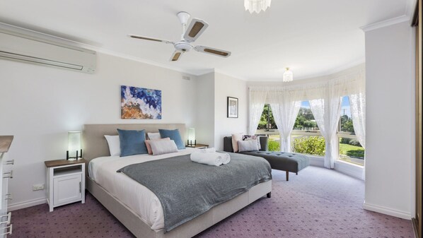 Upstairs there are 4 bedrooms. The spacious master comes a King room with fan and split system, the room has large windows and perfectly positioned chaise lounge. Enjoy quality time with a cup of tea relaxing in front of the large bay windows. The second and fourth bedroom both contain Queens, the third a tri-bunk with single bed.