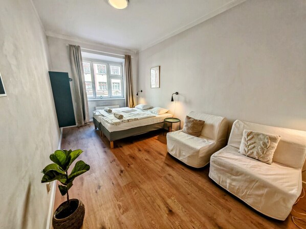 Zizkov is a vibrant neighborhood with plenty of bars, restaurants, and local attractions, including the TV Tower and Vitkov Hill. Next door to the apartment is a Tesco Express, making it easy to grab essentials. The tram stop is just a 5-minute walk away, and you can also walk to the city center in about 20 minutes.