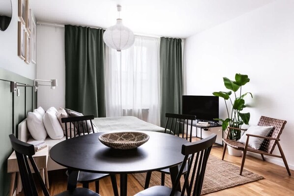 A kitchen table serves as a convenient workspace for any work or study needs. With self-check-in offered, we ensure a smooth, hassle-free start to your memorable Prague journey.