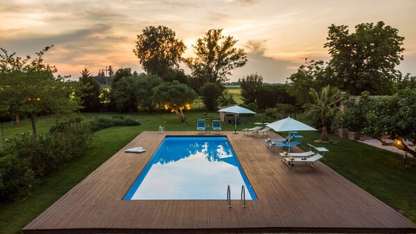 The swimming pool is on the same level as the house and can be easily reached across 30 metres of garden. Rectangular and measuring 4 x 10 m, with a constant depth of 1.40 m, the pool is lined in PVC and has salt purification and a ladder for access to the water. The surrounding area in wood is equipped with sunbeds and umbrellas. The pool is available to guests from the last Saturday in April until the first Saturday in October.
