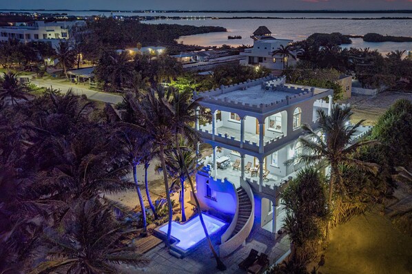 The Sandcastle House, Tres Cocos is a gorgeous 3-story home which was recently thoroughly remodeled. It is located in the exclusive Tres Cocos neighborhood on Ambergris Caye, approximately 10 minutes from the town center. The home has a brand-new swimming pool and a beautifully built pier with a seating area and palapa for great relaxation right on the ocean.