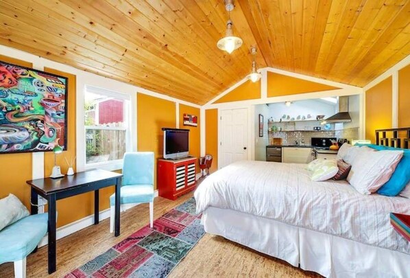 Located in the south end of delightful West Seattle, this cozy space is full of artful touches. Queen bed, 3/4 bathroom, lovely kitchen with oven/stove, microwave, mini-fridge. Parking space off-alley for mid-size & smaller cars. You'll have some outdoor space all to yourself on the deck.
