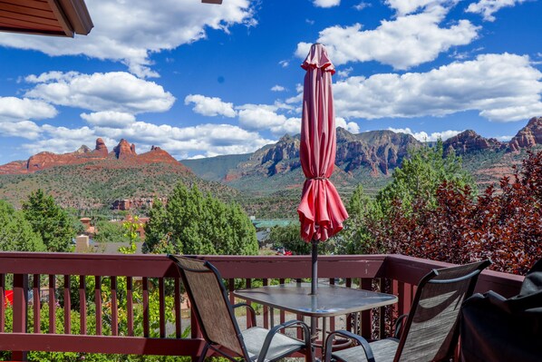 Location is superb, and the views are breathtaking. Walk to uptown in minutes for dinner, shopping and a gallery stroll before enjoying a quiet evening afterwards on the deck overlooking the Red Rocks as the sun sets. This two-bedroom, two bath home sleeps 5 and is literally just a block off main street in Uptown. Home has exceptional views and is in a very quiet neighborhood. The space is unique and boasts a large great room and deck great for gathering friends and family after a day exploring Sedona.
