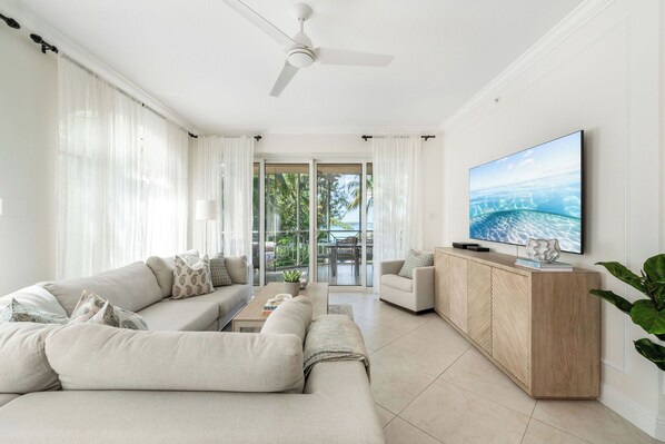 Relax on the screened porch with comfortable lounge seating, or enjoy the many outdoor dining and lounging spaces throughout the property. Guests also have access to BBQ grills and a pristine white-sand beach, complete with shade huts and umbrellas.