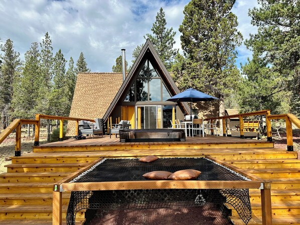 Nestled in serene private land just 3 miles from Downtown Sisters, OR, Destination Sister's A-frame cabin offers a tranquil retreat. With three cozy bedrooms and an open design kitchen perfect for entertaining, this unique getaway also features fresh eggs from the on-site chicken coop and veggies from the greenhouse.