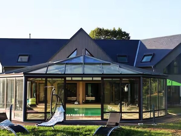 Architect-designed house 20 minutes from the 24 Hours of Le Mans circuit, in the heart of the Sarthe countryside. A peaceful, idyllic, and secluded setting, perfect for 8 adults and children, for quality time with family and friends. Surrounded by centuries-old trees that will delight your eyes. You can enjoy the heated swimming pool (12m x 6m) in all seasons without ever leaving the house. Ideal for relaxation. One bedroom is accessible to people with disabilities.