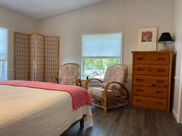 When it's time to turn in, the cottage offers five inviting bedrooms, each with its own unique vibe. Soft linens, neutral tones, and thoughtful touches make each space feel like a private retreat - Whether you're dozing off to the sound of crickets or sleeping in after a sunrise walk along the pier. The primary bedroom provides a restful escape, while additional guest rooms accommodate couples, families, or friends with ease.