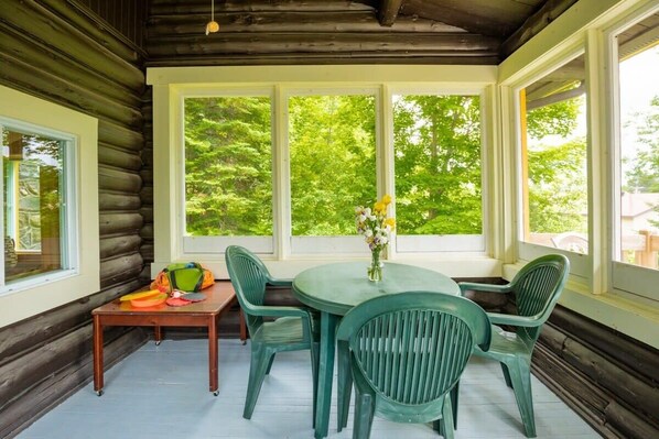 The dining area is great for sharing meals or gathering around a puzzle while enjoying the view.
