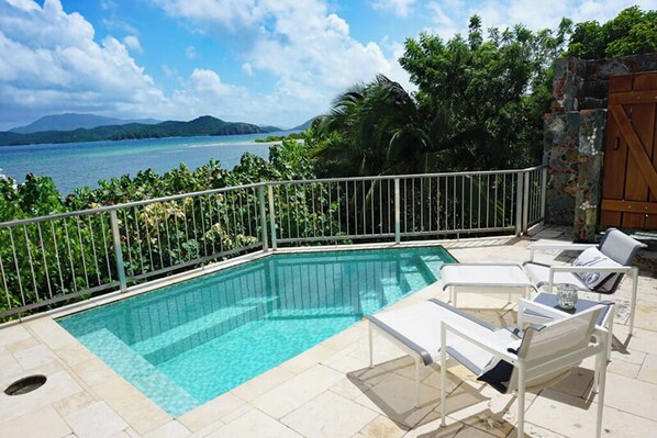 LOCATION: Ciboney is located in Johnson Bay Estates, which is a quiet area carved out of the western shore of Coral Bay, on the southeast end of St. John. In front of your villa, there is a small, reef protected sand/pebble/seagrass beach. The very picturesque view stretches from the village of Coral Bay at the head of the harbor in the northwest, to the mouth of Coral Bay in the east (Coral Bay refers to a small village, a body of water and also the large land area surrounding the bay.) Although Ciboney faces east the pool and sun deck are bathed in sunshine for most of the day, and the trade winds are partially blocked so they usually blow mild yet refreshingly cool perfect weather for enjoying the pool and deck. There are only four villas along the beach at Johnson Bay, so this setting remains tranquil, restful and romantic. Its a 25-30 minute drive into Cruz Bay, and a 4-10 minute drive to the restaurants, bars, and groceries in Coral Bay, and a 15-20 minute drive to the National Park beaches located along the north shore.