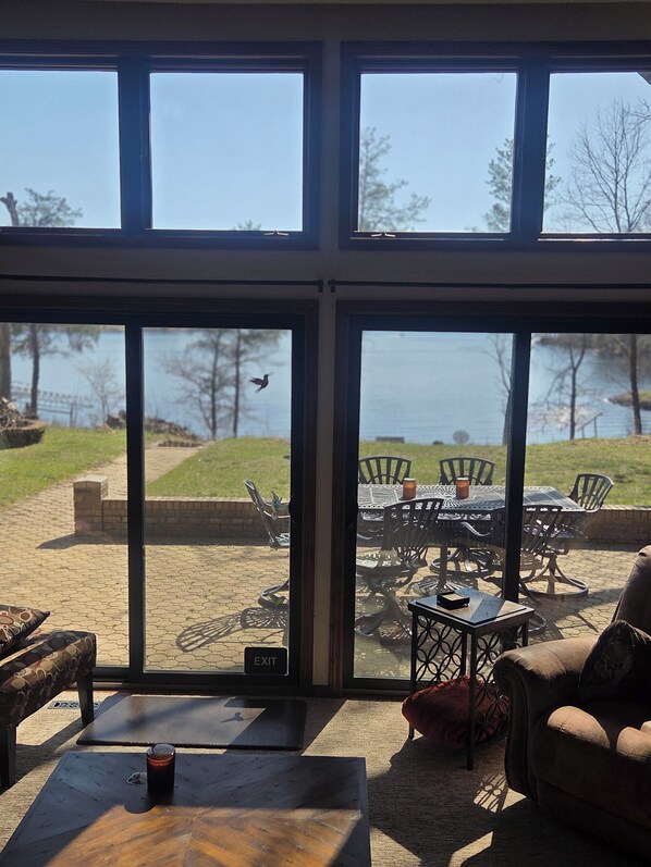 Welcome to Loenneth (The Lake House)This all brick home is right on the lake with a dock to tie your boat up to or to fish off of. The 1700 sq foot home is full of large windows with breath taking views. The all brick large patio surrounds 3/4 of the house with a table that seats 6 for outside dining with umbrella. There is a large fire pit for hanging out at in the evenings with all the wood you need.