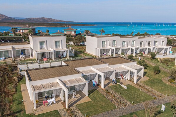 The property, built in 2020, stands a few hundred meters from one of the most beautiful beaches in the world, La Pelosa, which overlooks the marine protected area of Asinara Island that became a National Park in 2002. Finely furnished and equipped with every comfort, the apartments can be on the ground floor with patio or on the first floor with terrace, equipped with table and chairs.